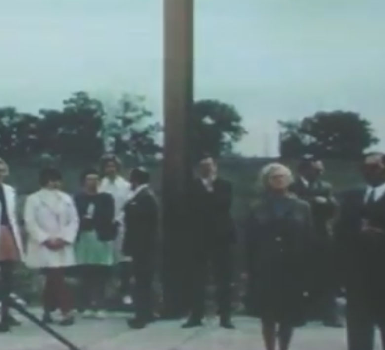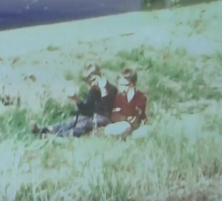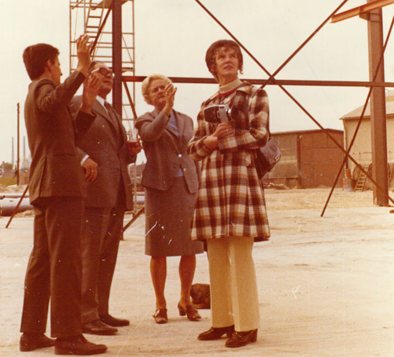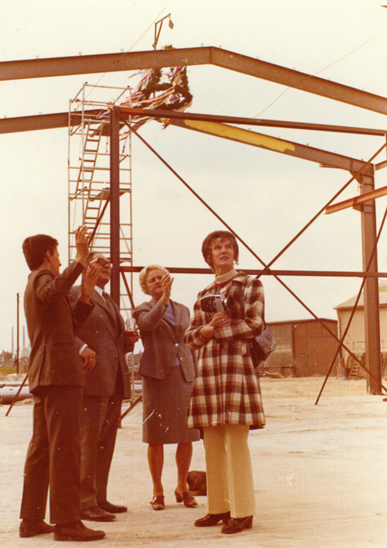 September 1971, Richtfest Strahlhalle. Im Bild v.R.n.L. Hildegard Krebs, Irma Krebs, Robert Krebs, Architekt Junker (Foto vermutlich von Walter Krebs gemacht)