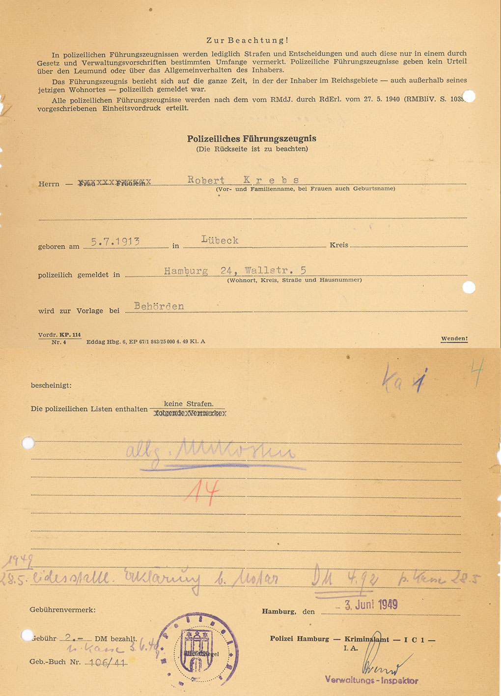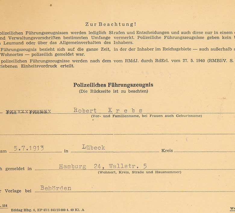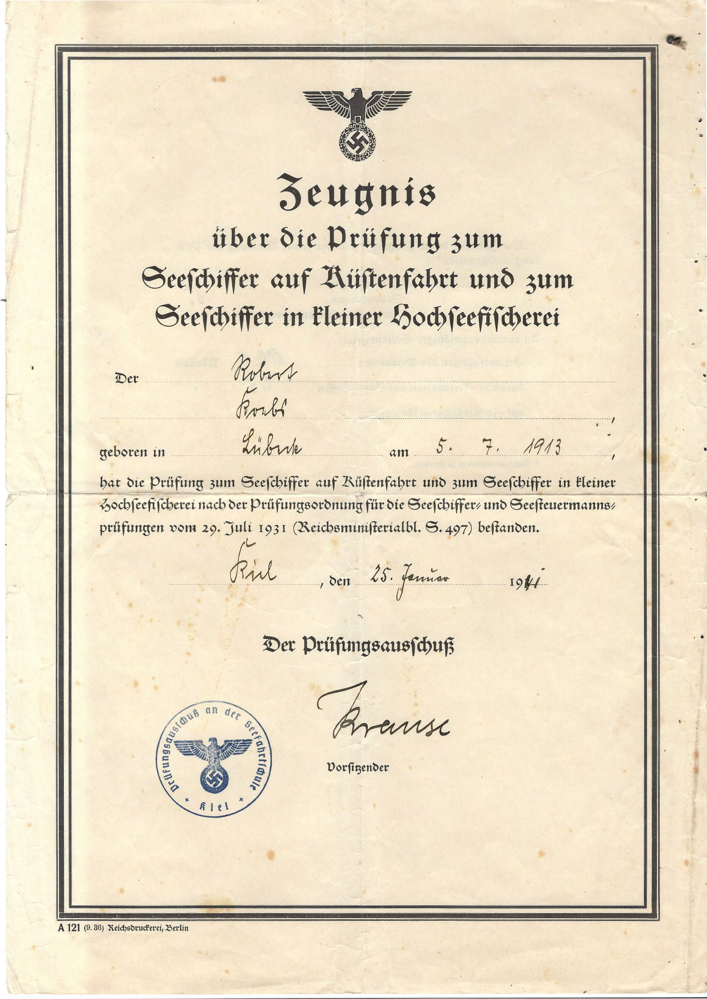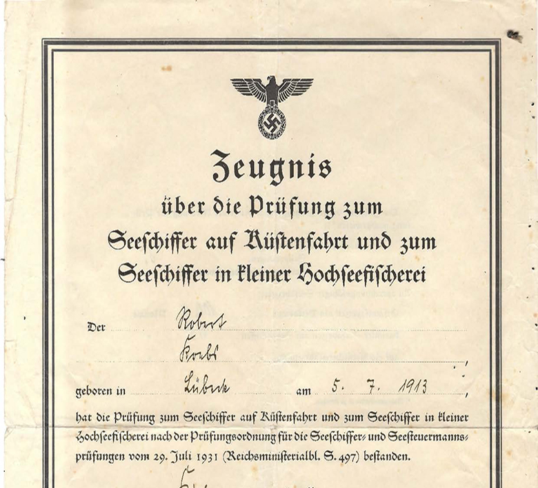 Robert Krebs, am 5.7.1913 in Lübeck geboren, ist zur See gefahren und hat am 25. Januar 1941 die Prüfung zum Seeschiffer auf Küstenfahrt und zum Seeschiffer in kleiner Hochseefischerei bestanden.