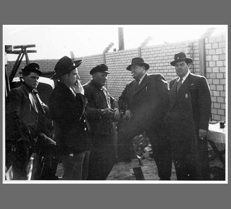 Es ist so weit! Das Richtfest, heute Buschwerder Hauptdeich 50 Im Bild die Zimmerleute und Dachdecker sowie Firmengründer Robert Krebs (ganz rechts) und links daneben Gustav Krebs.