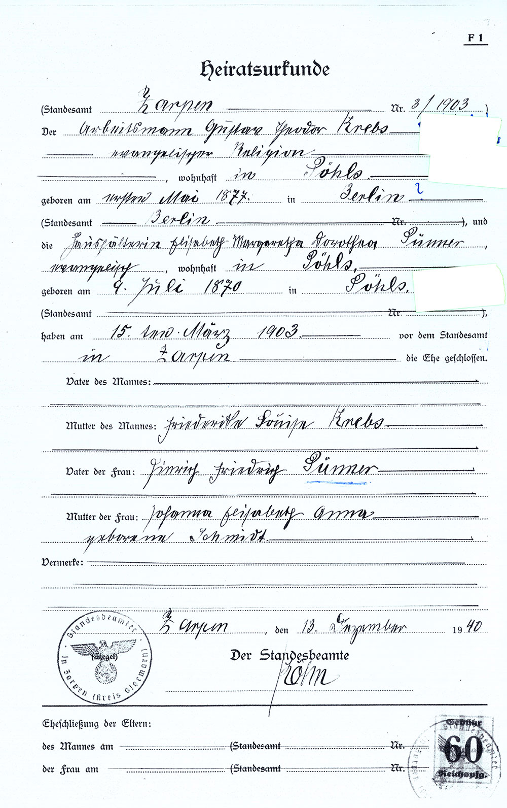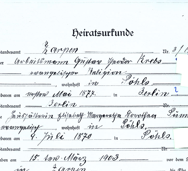 Heiratsurkunde des Arbeitsmannes Gustav Theodor Krebs, 1870 in Berlin geboren, mit Elisabeth Pünner vom 15. März 1903 in Farpen. Beide wohnten in Pöhls, nordöstlich von Bad Oldesloe