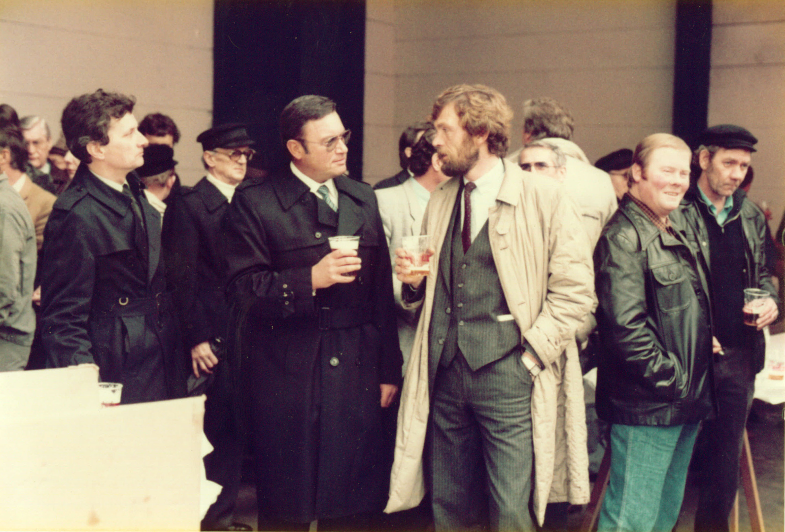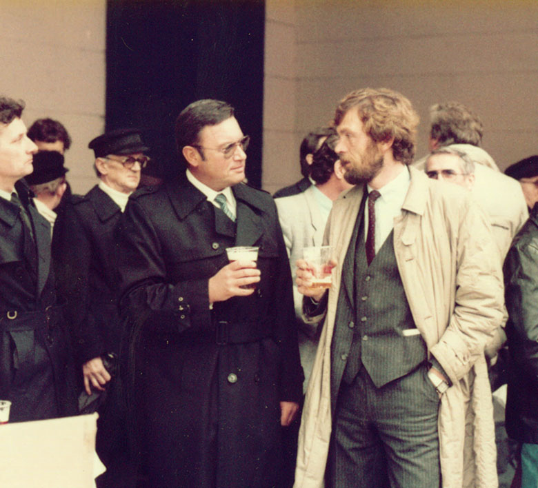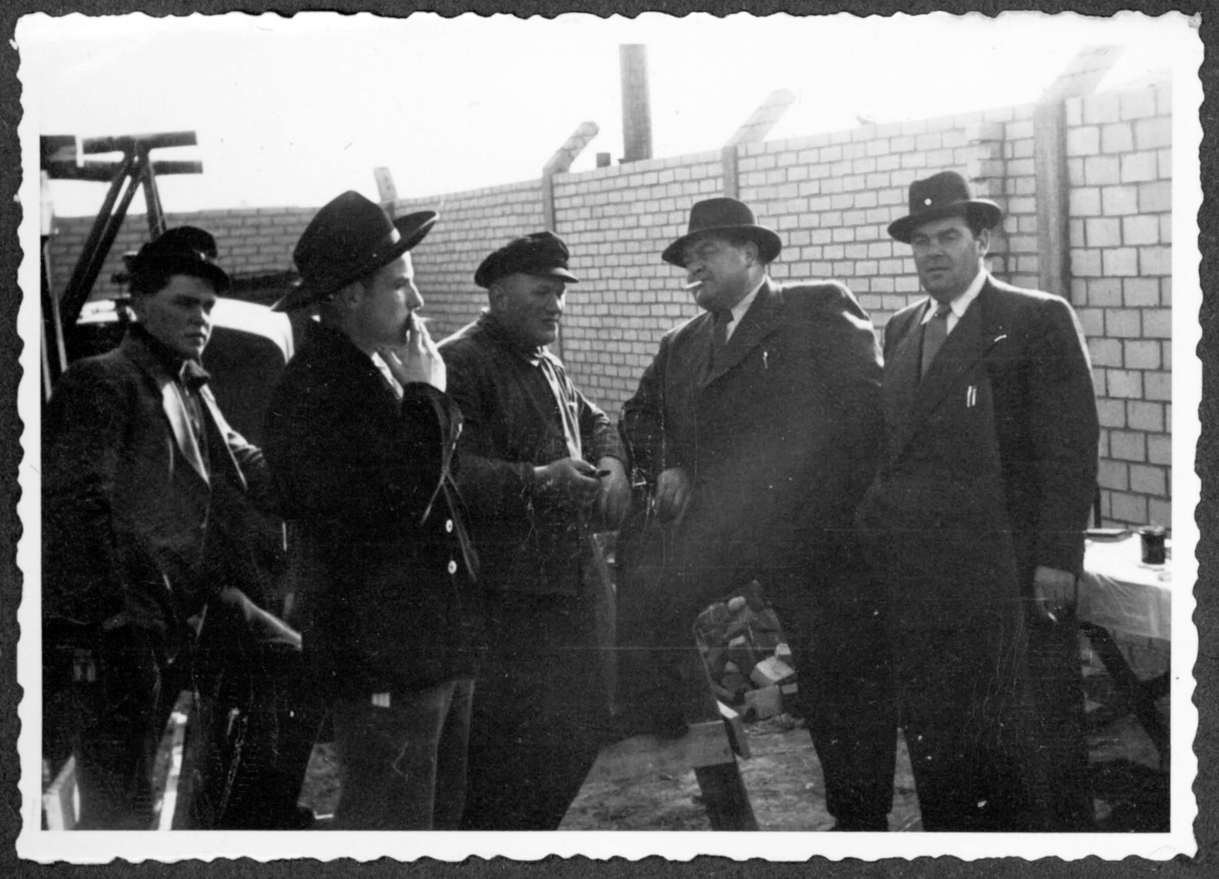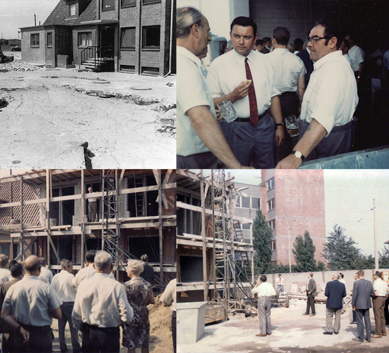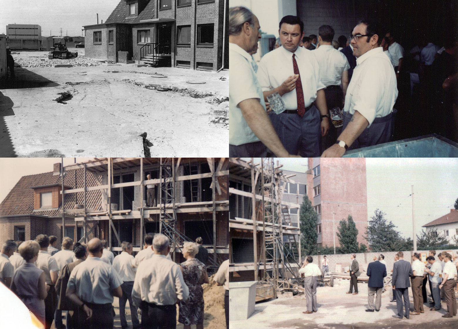 Walter Krebs und Josef Wollenweber (Bruder von Hildegard Krebs) beim Richtfest der Strahlhalle. Rechts im Bild „Krümmel“ Heinz Peters und Uwe Christiansen, ehemalige Mitarbeiter von Krebs