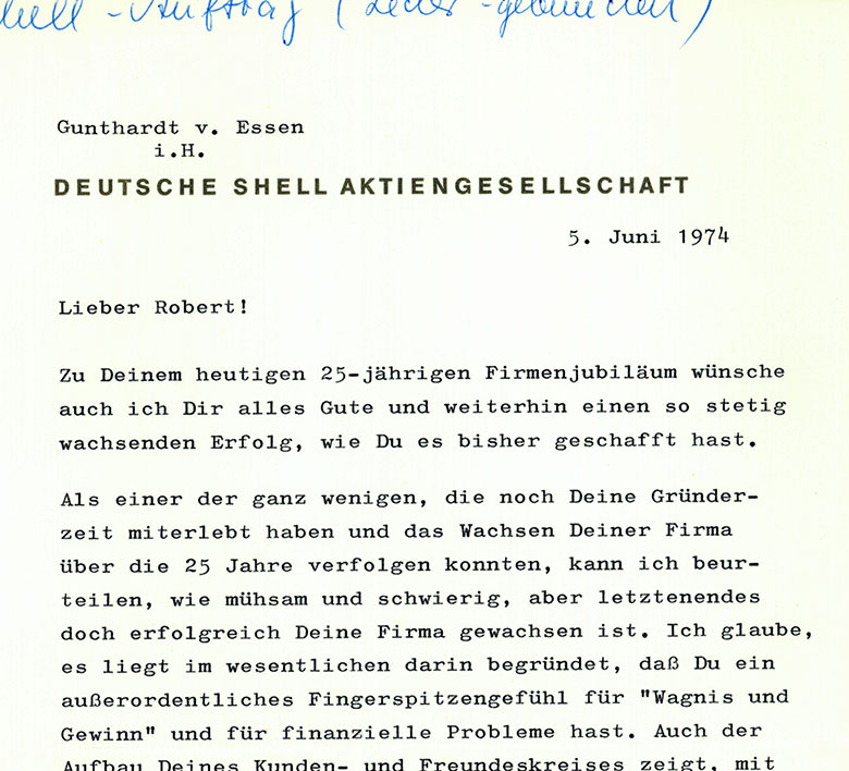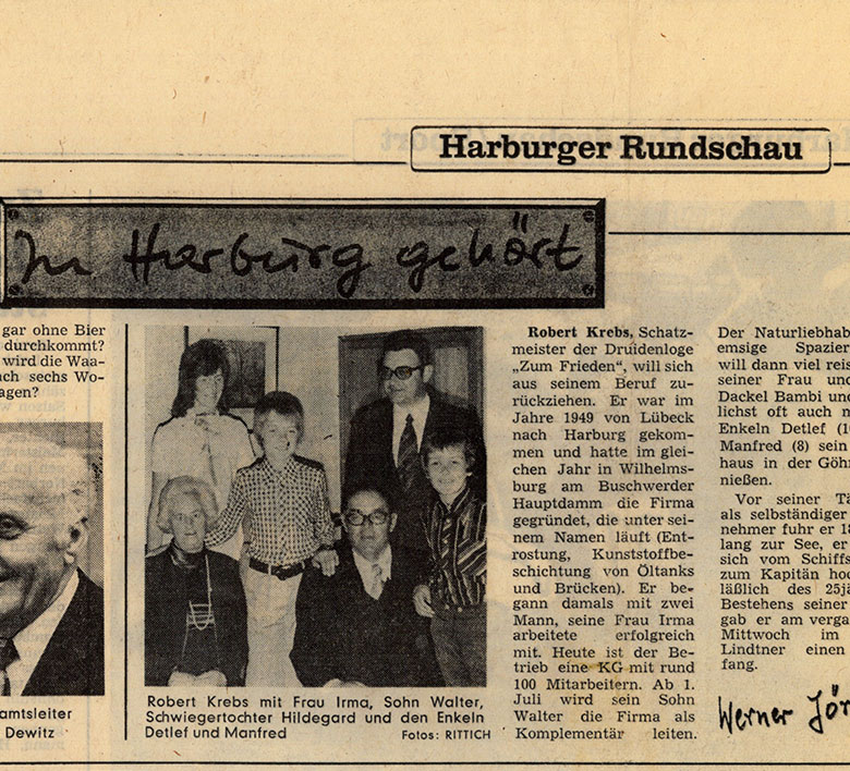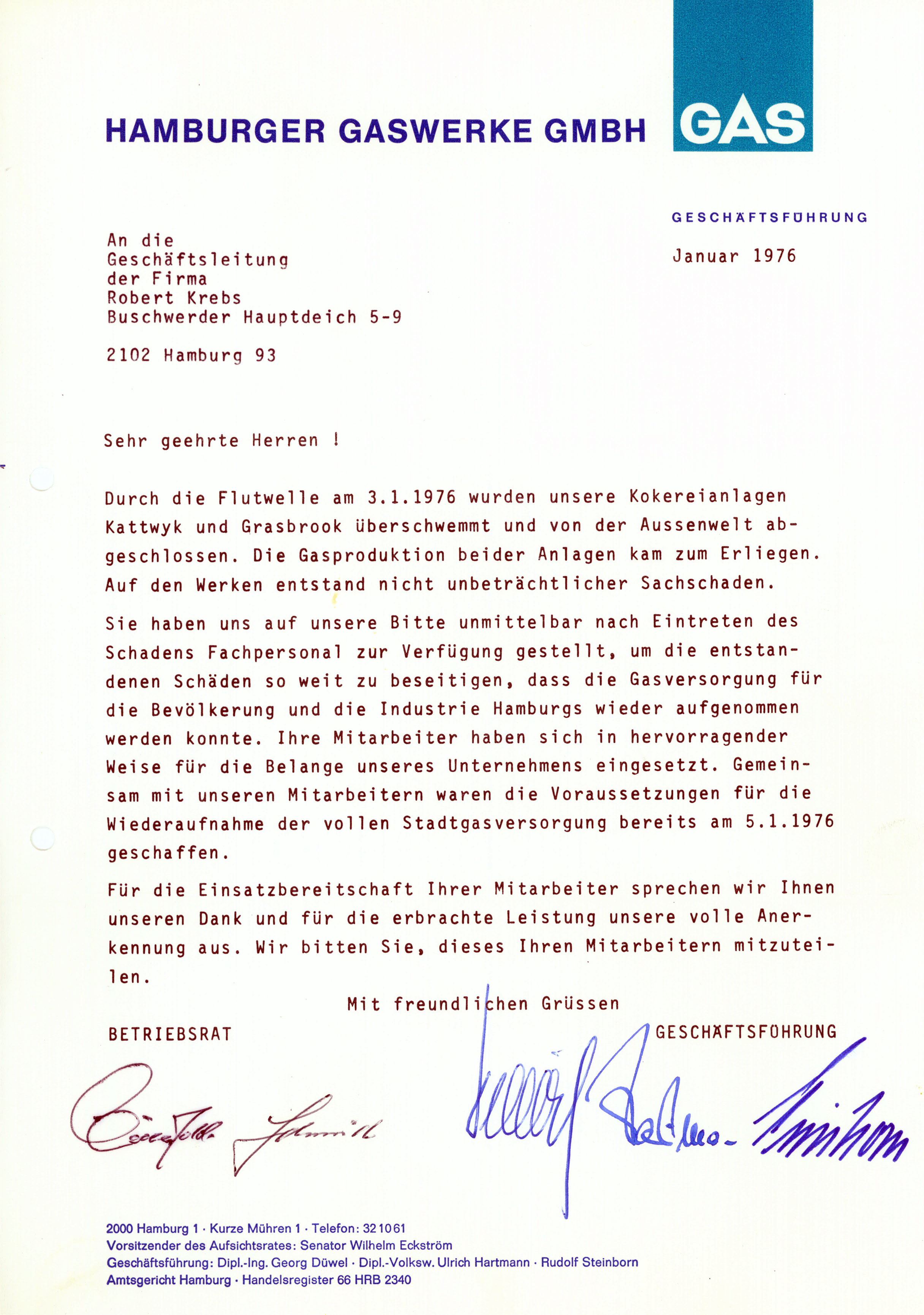 Dankschreiben der Hamburger Gaswerke für den Einsatz der Fa. R. Krebs bei der Hochwasserkatastrophe 1976 in Hamburg. Schon immer stellte sich die Krebsgruppe auch gesellschaftlichen Herausforderungen und in den Dienst an der Allgemeinheit.