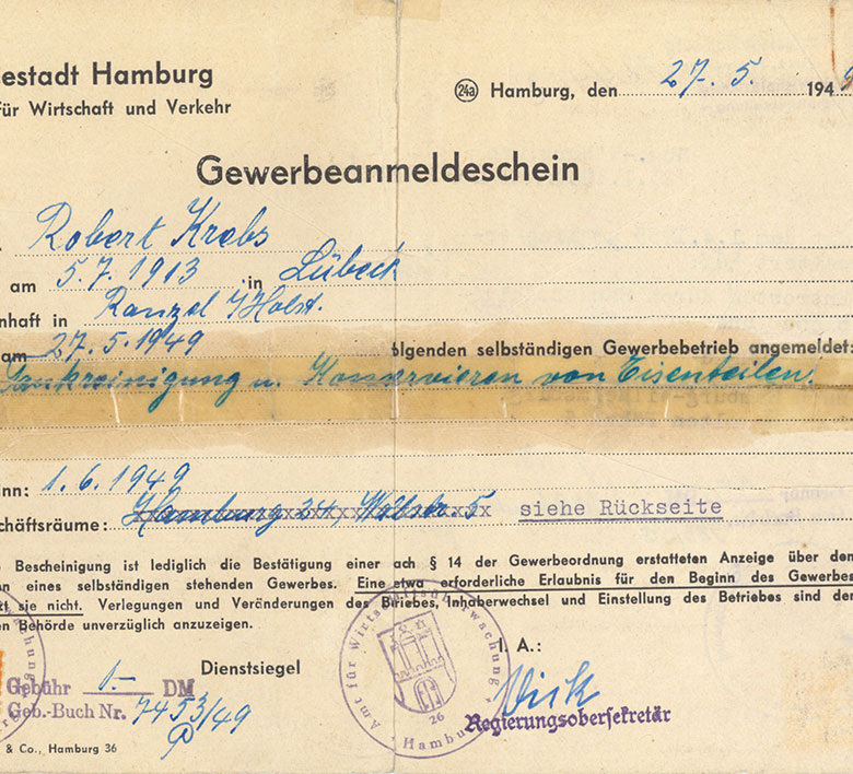 Der Gewerbeanmeldeschein von Robert Krebs, wirksam zum 01.06.1949 einschl. späterer Erweiterungen