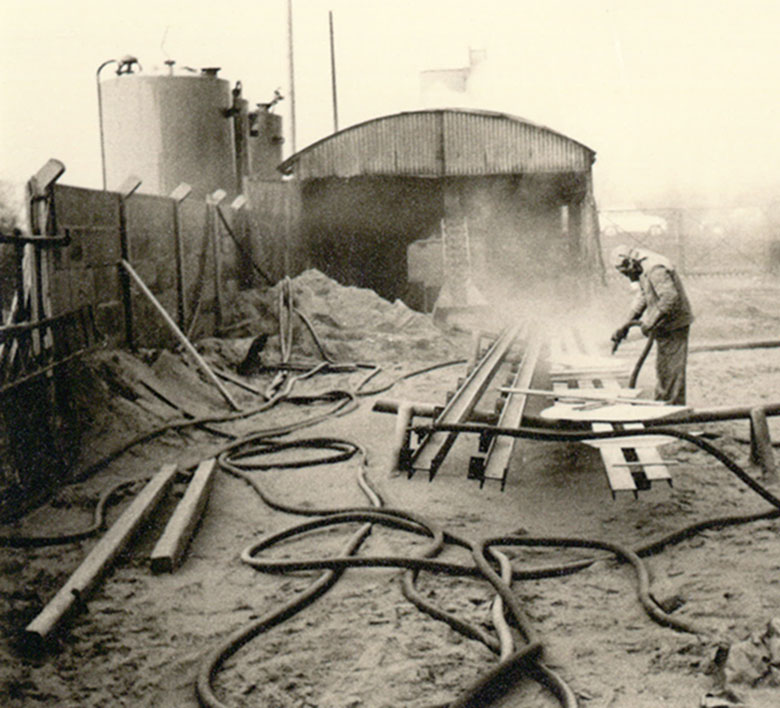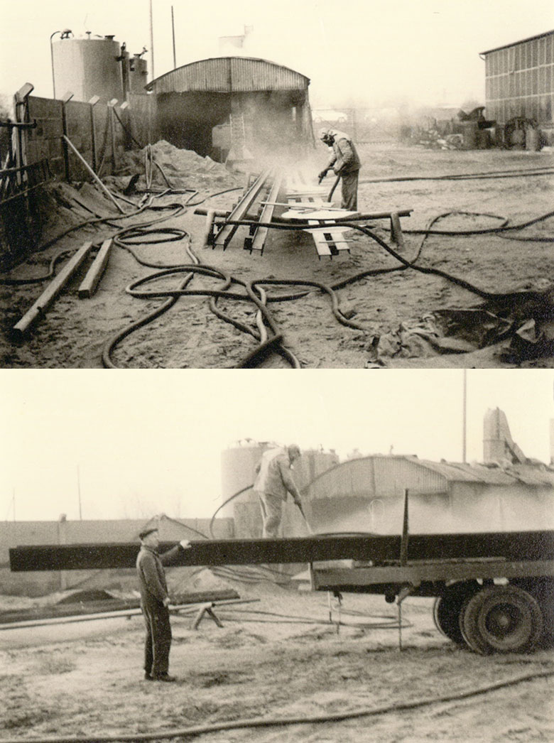 Sandstrahlarbeiten unter freiem Himmel!Im Vergleich arbeitet man heute umweltgerecht und unter strengsten Auflagen. Krebs ist als Vorzeigebetrieb für diese Arbeiten zertifiziert!