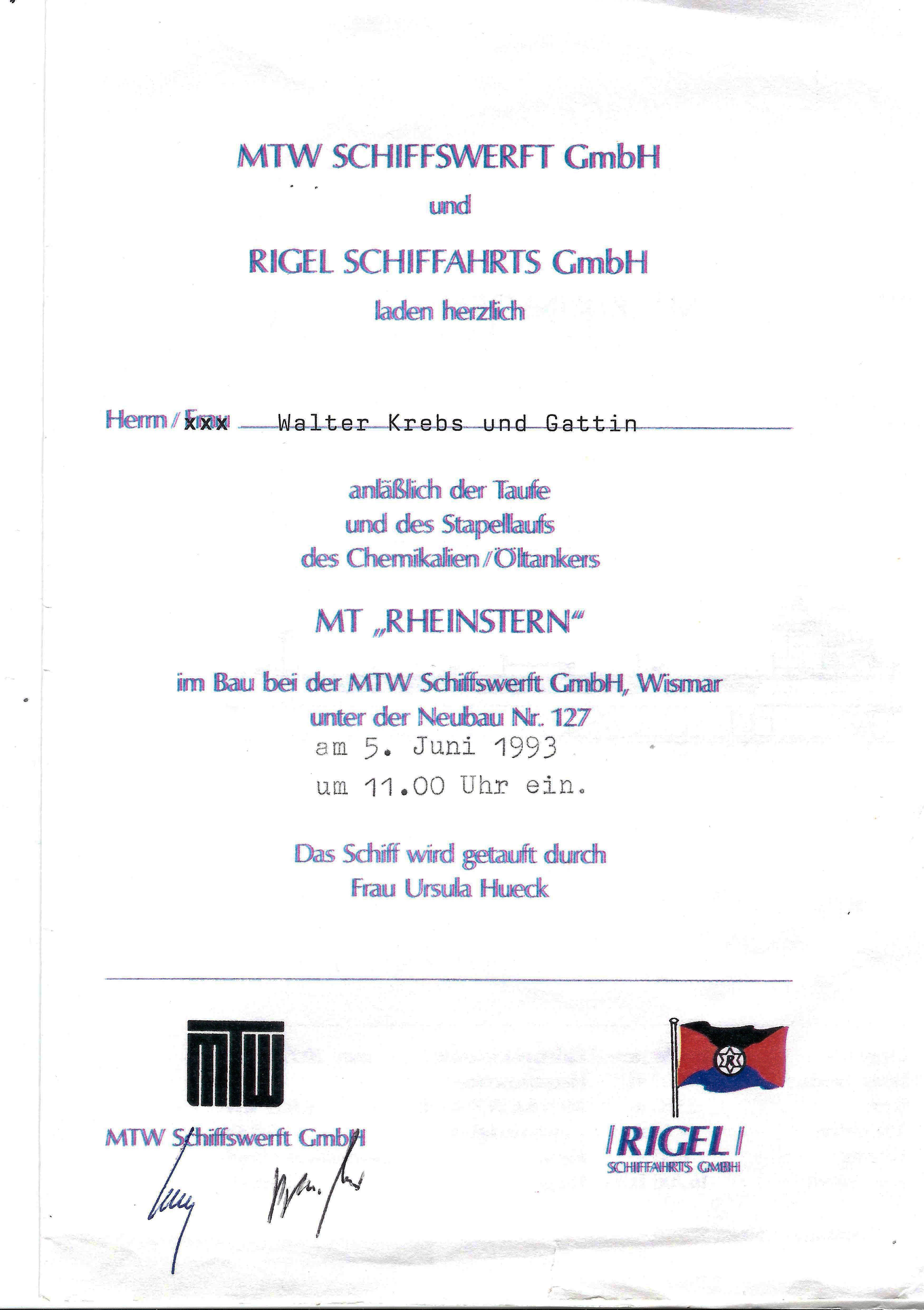 Einladung Stapellauf MT Rheinstern 1993.
