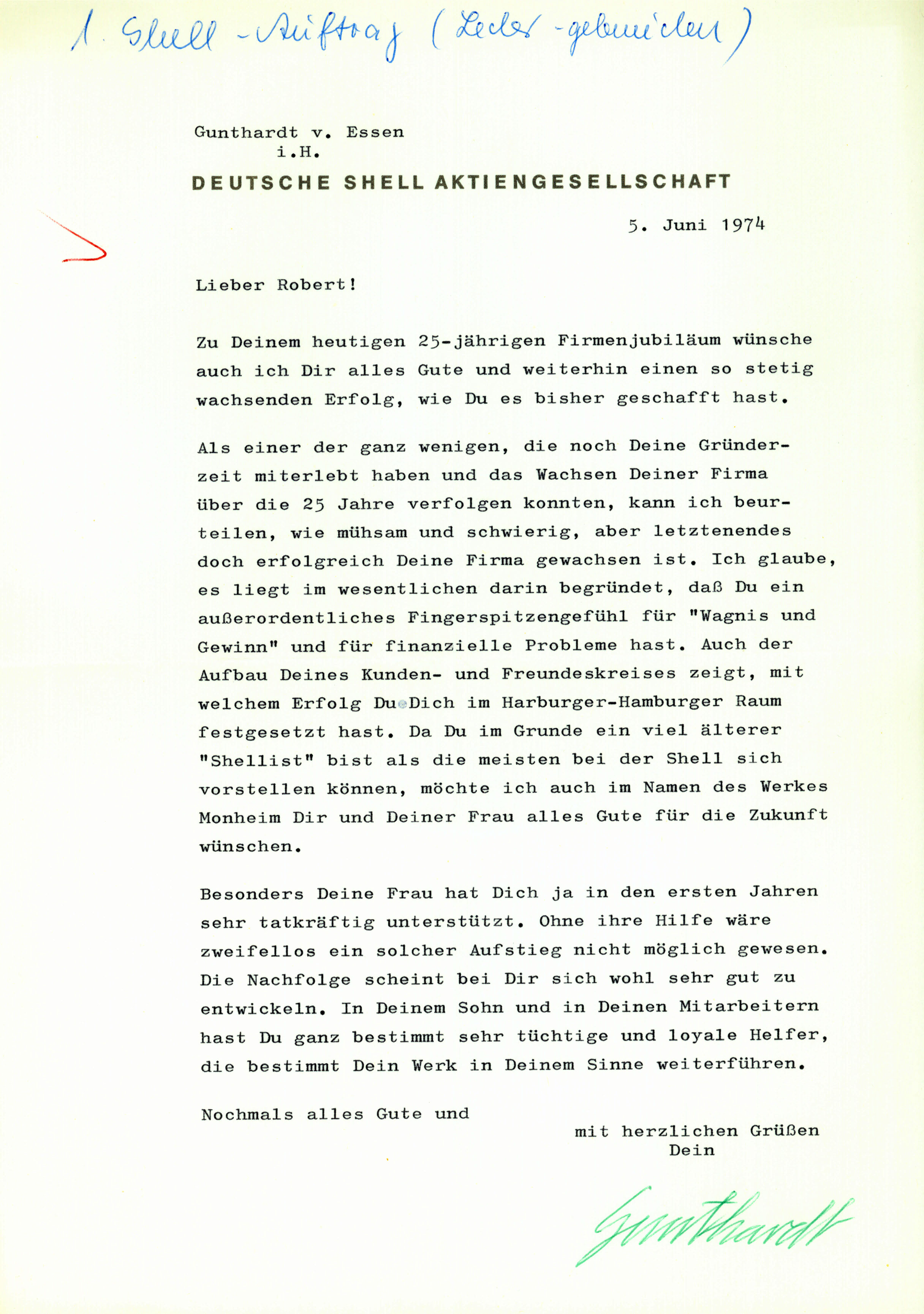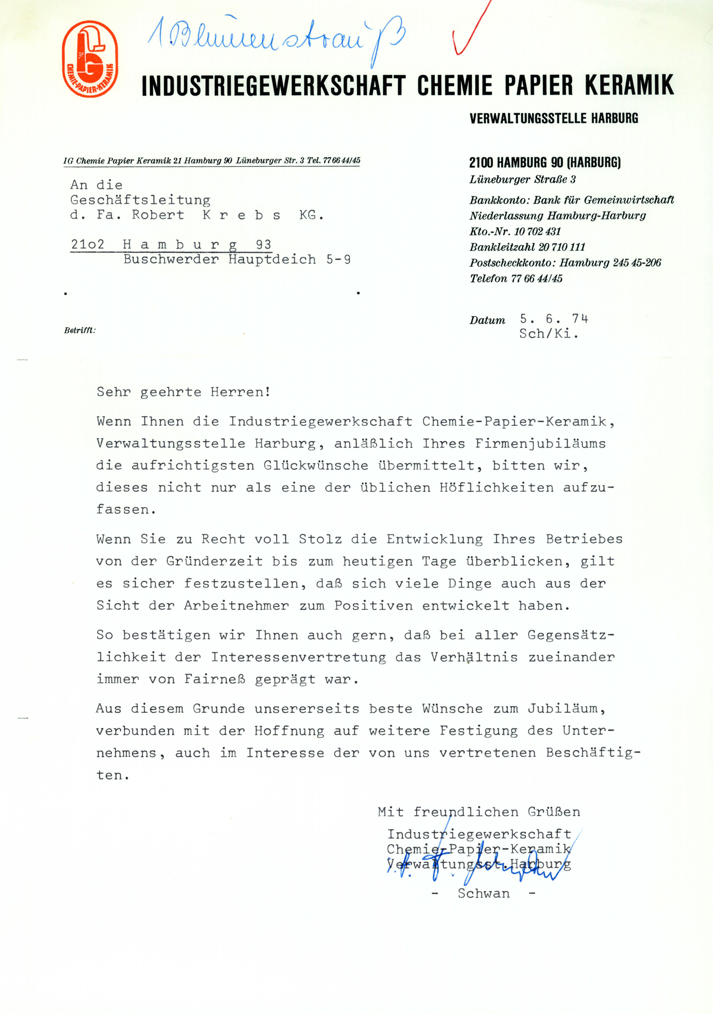 Glückwunschschreiben der IG CPK zum 25. Firmenjubiläum. Auch damals schon wurde bei Krebs die Sozialpartnerschaft gelebt!
