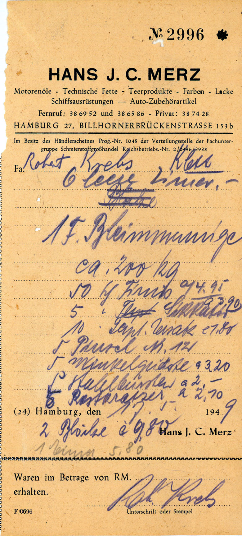 Eine der ersten Rechnungen der Fa. Robert Krebs über Material und Werkzeug: 200 kg Bleimennige usw.